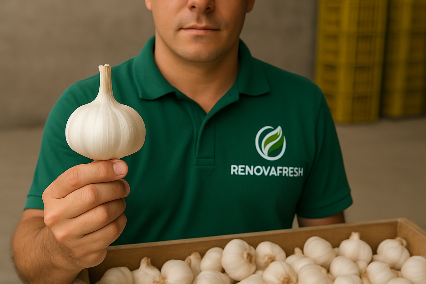 Ajo de alta calidad, cuidadosamente calibrado y seleccionado manualmente para garantizar bulbos grandes, uniformes y con excelente presencia. Ideal para exportación y mercados que exigen producto calidad superior conforme a la normativa comercial