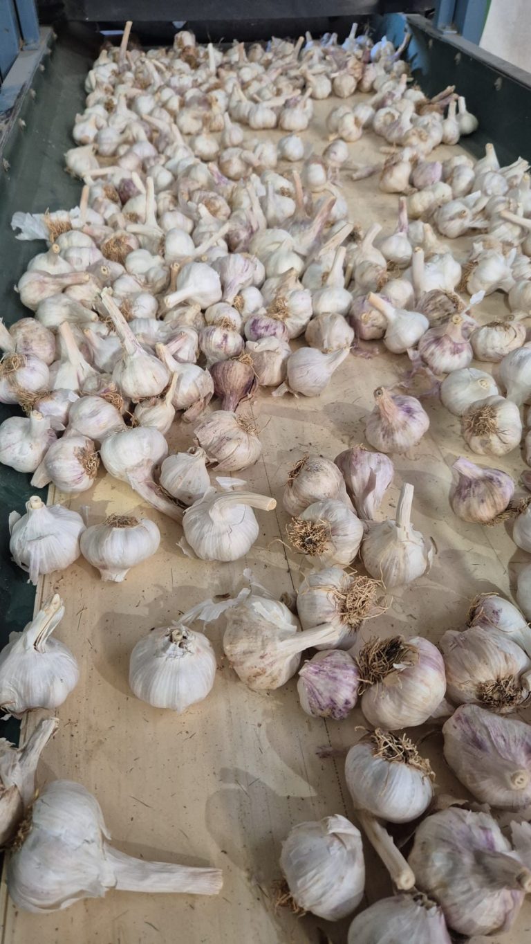 Ajo morado sometido a un proceso de clasificación y selección conforme a los estándares comerciales europeos, garantizando bulbos sanos, firmes y libres de defectos graves. Cada lote es revisado en mesa de selección para asegurar uniformidad, correcta limpieza y cumplimiento de los requisitos de Categoría I.